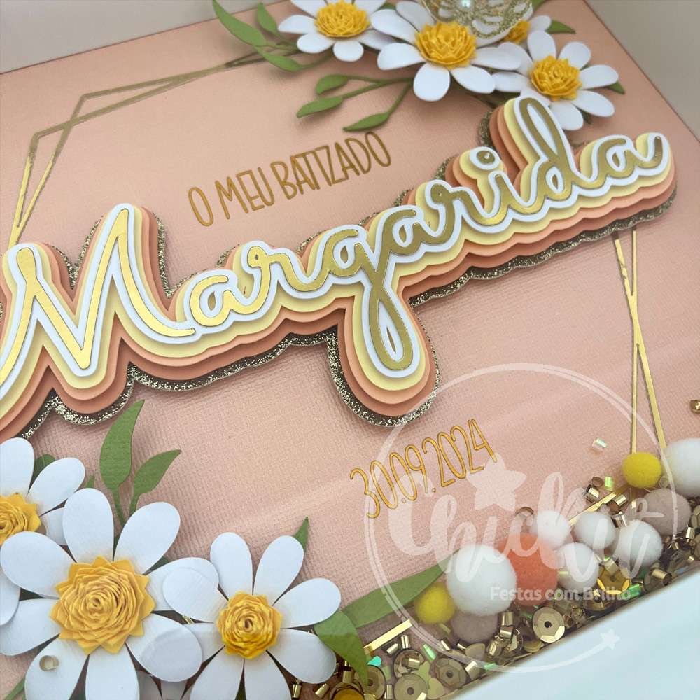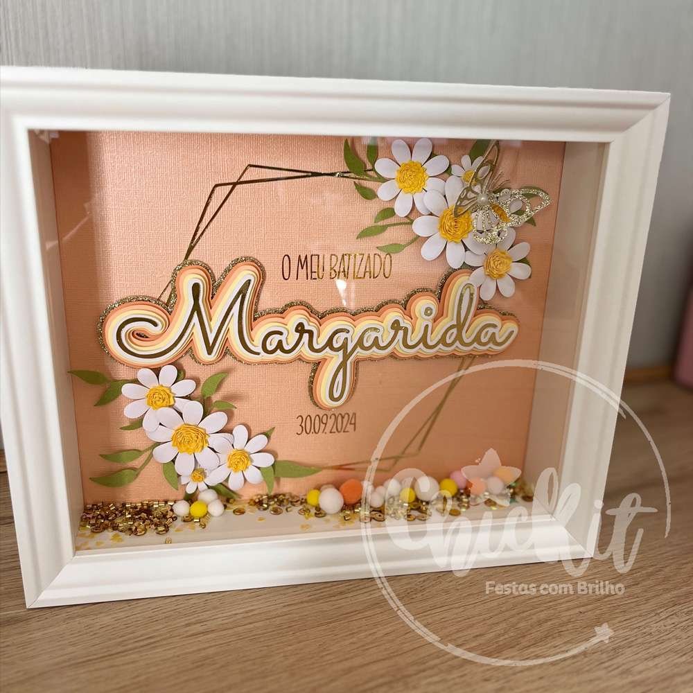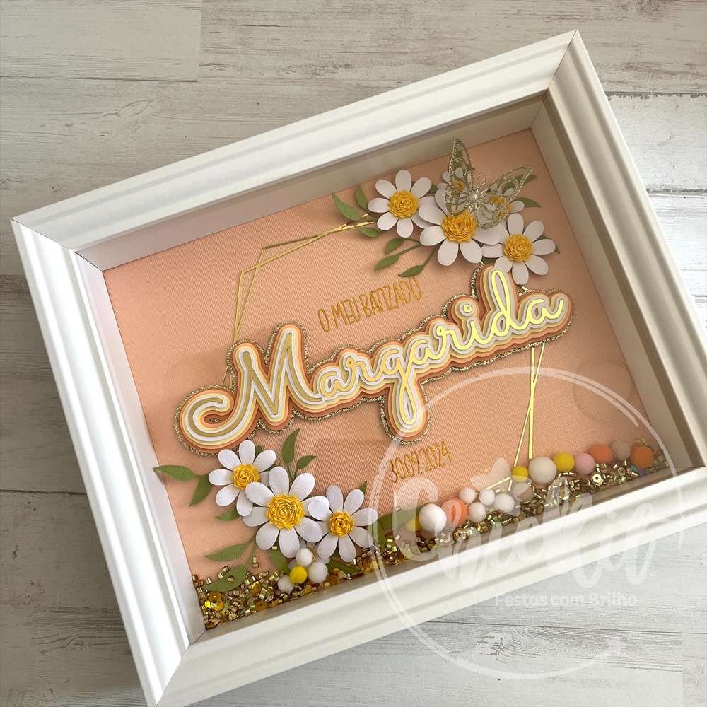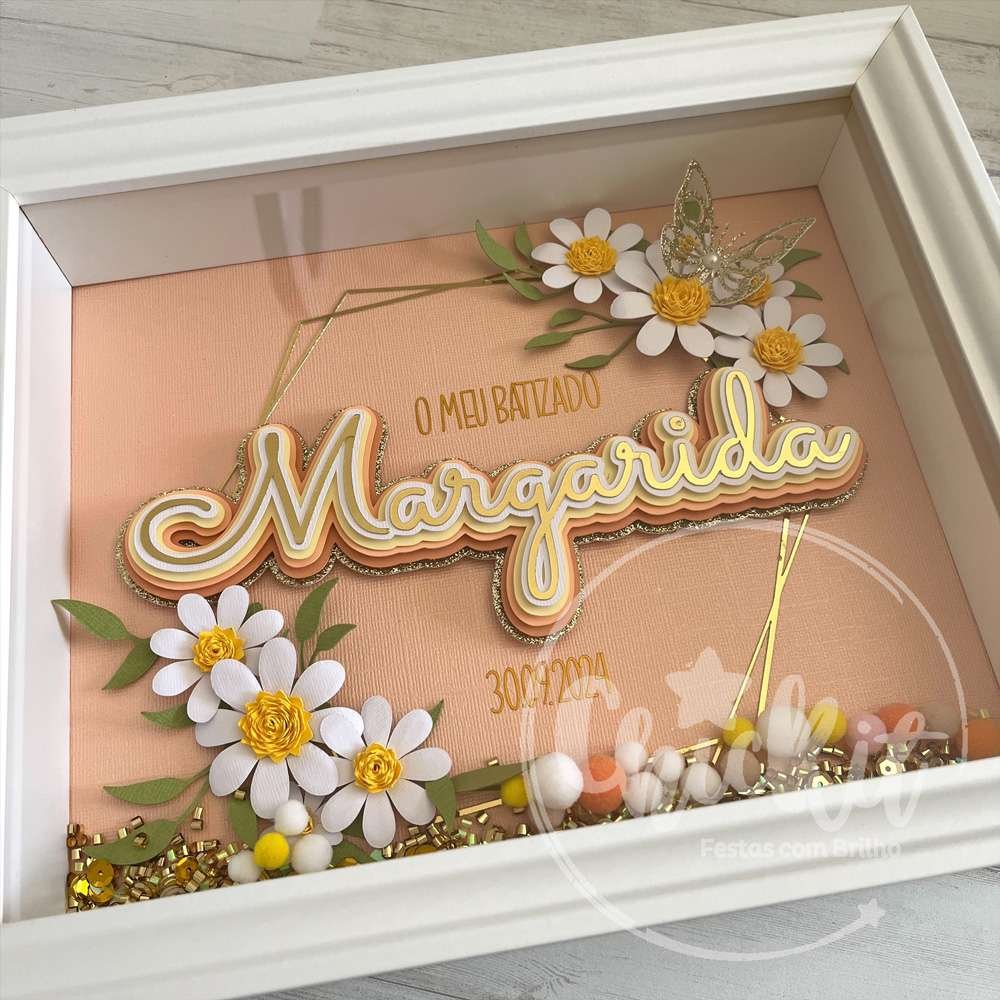 Um quadro muito bonito e elegante, com pequenas flores de papel e o nome em camadas.