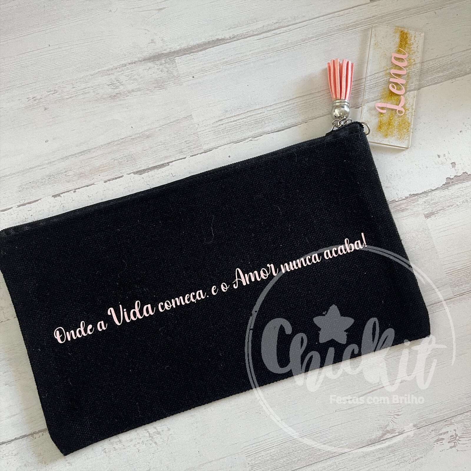 Bolsa Preta com Fecho. Pendente em acrílico com Personalização de Nome.