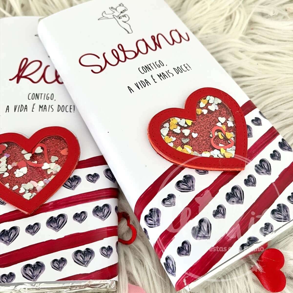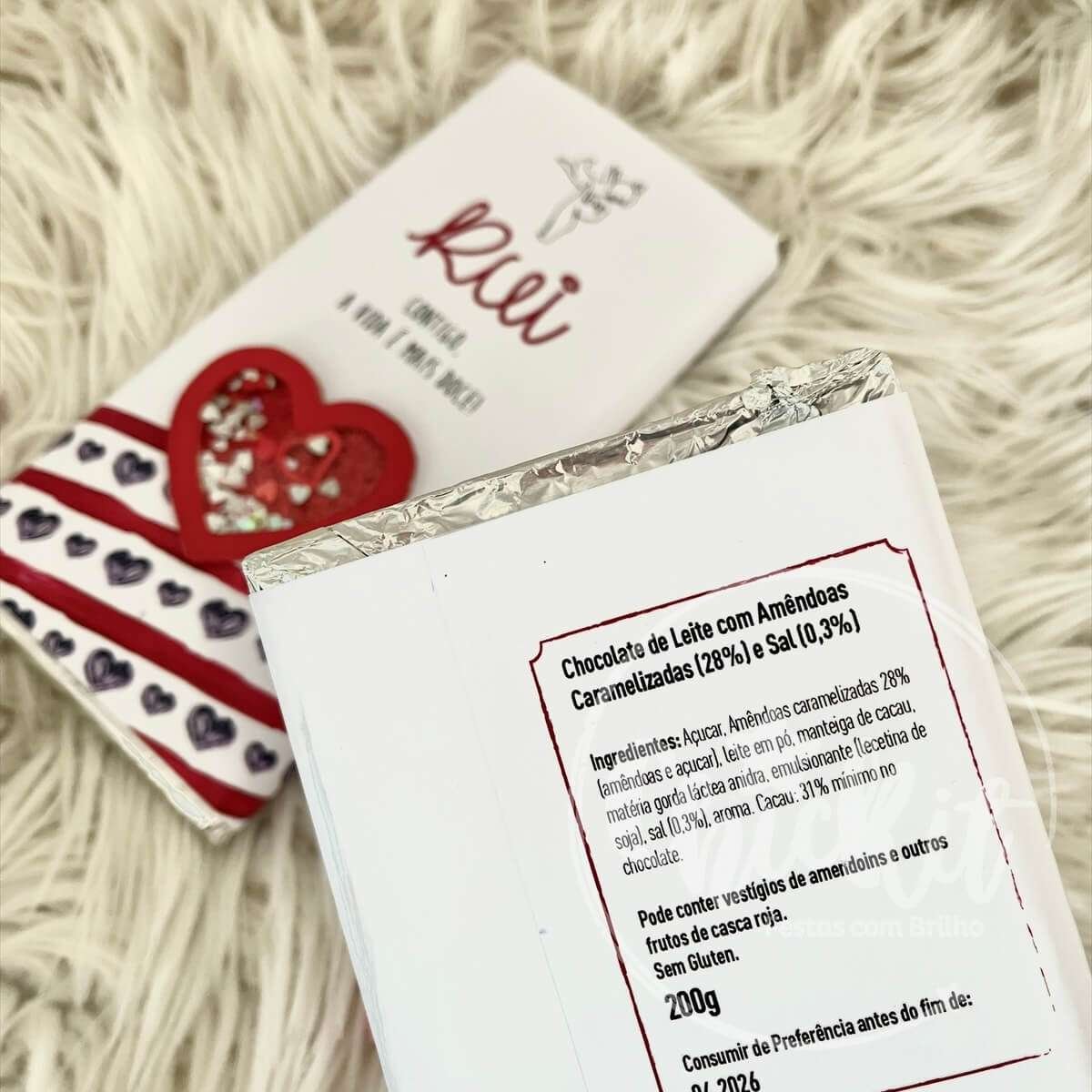 Este chocolate de leite com amêndoas caramelizadas (200g) vem envolvido numa embalagem personalizada com o nome da pessoa amada e a mensagem “Contigo, a vida fica mais doce!”