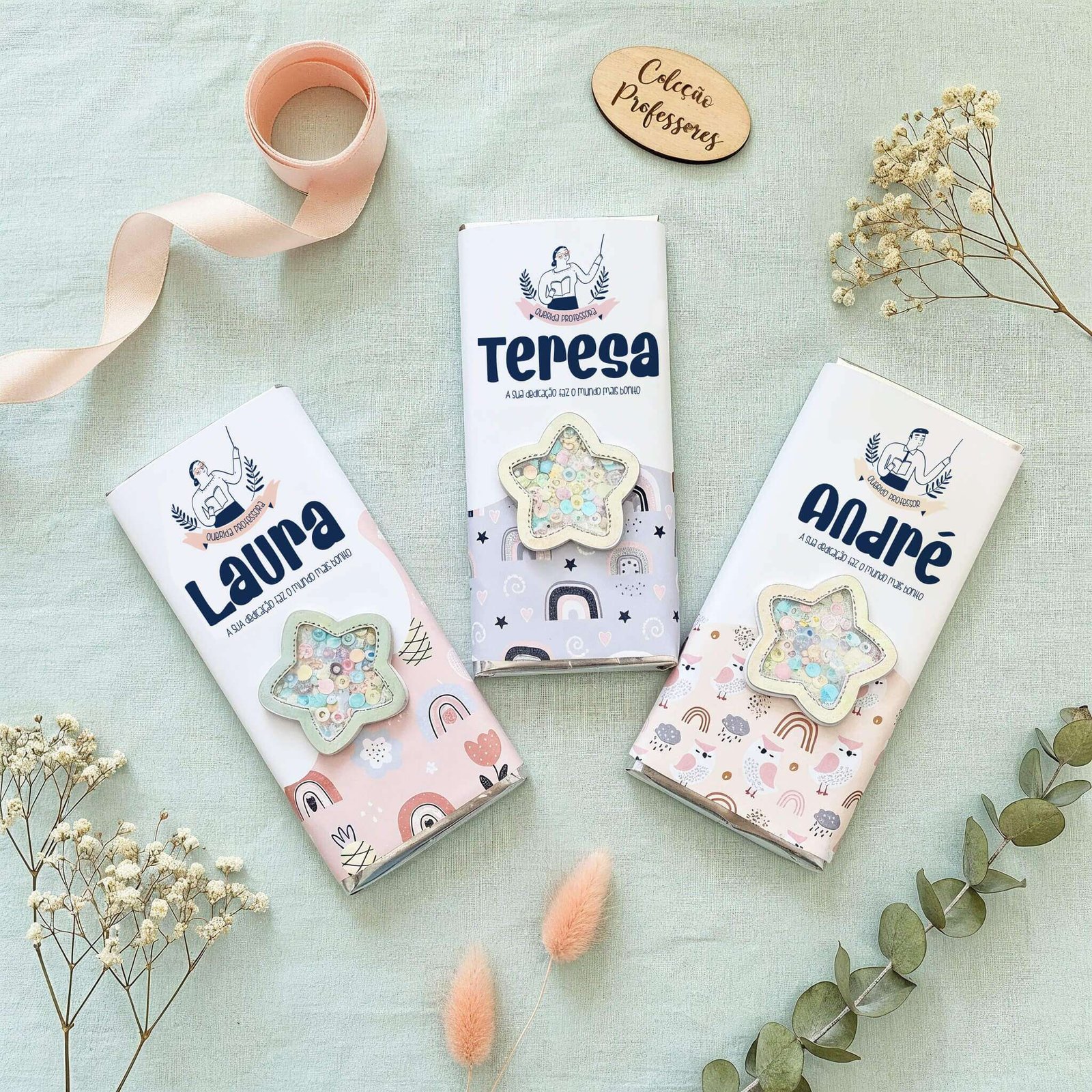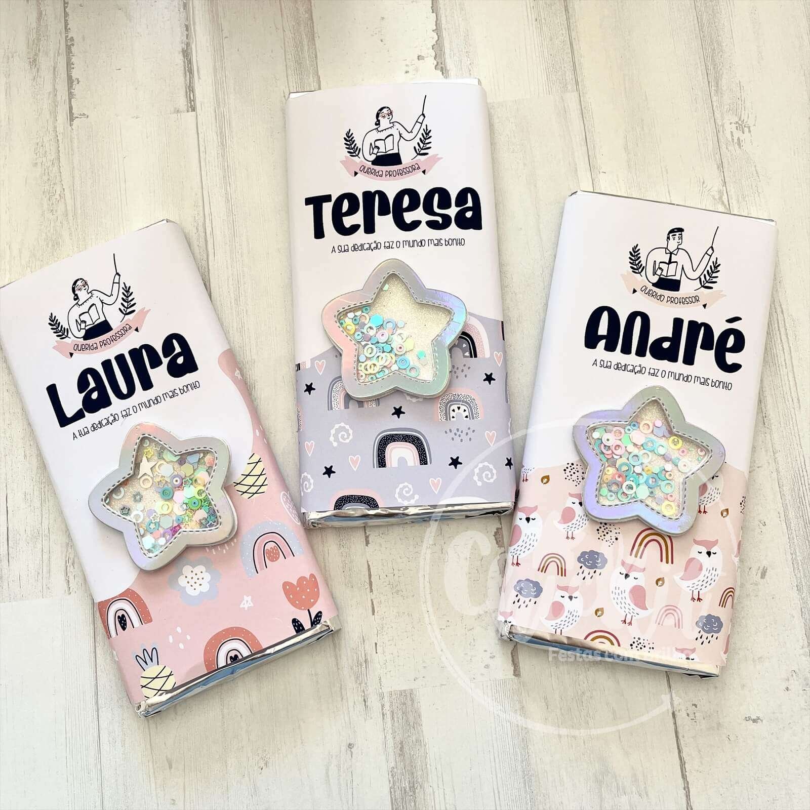 Tablete de 200g de Chocolate de leite com amêndoas caramelizadas e sal, personalizada com o nome do professor e com 3 modelos à escolha.