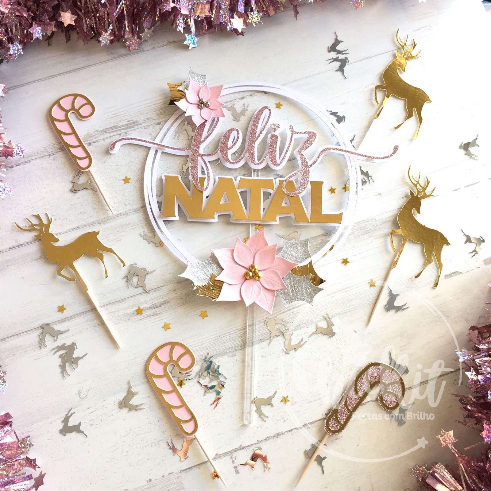Inclui 1 topo encantador com a mensagem “Feliz Natal”, 3 mini-topos com silhuetas de renas e 3 mini-topos com a forma de bengalas festivas.