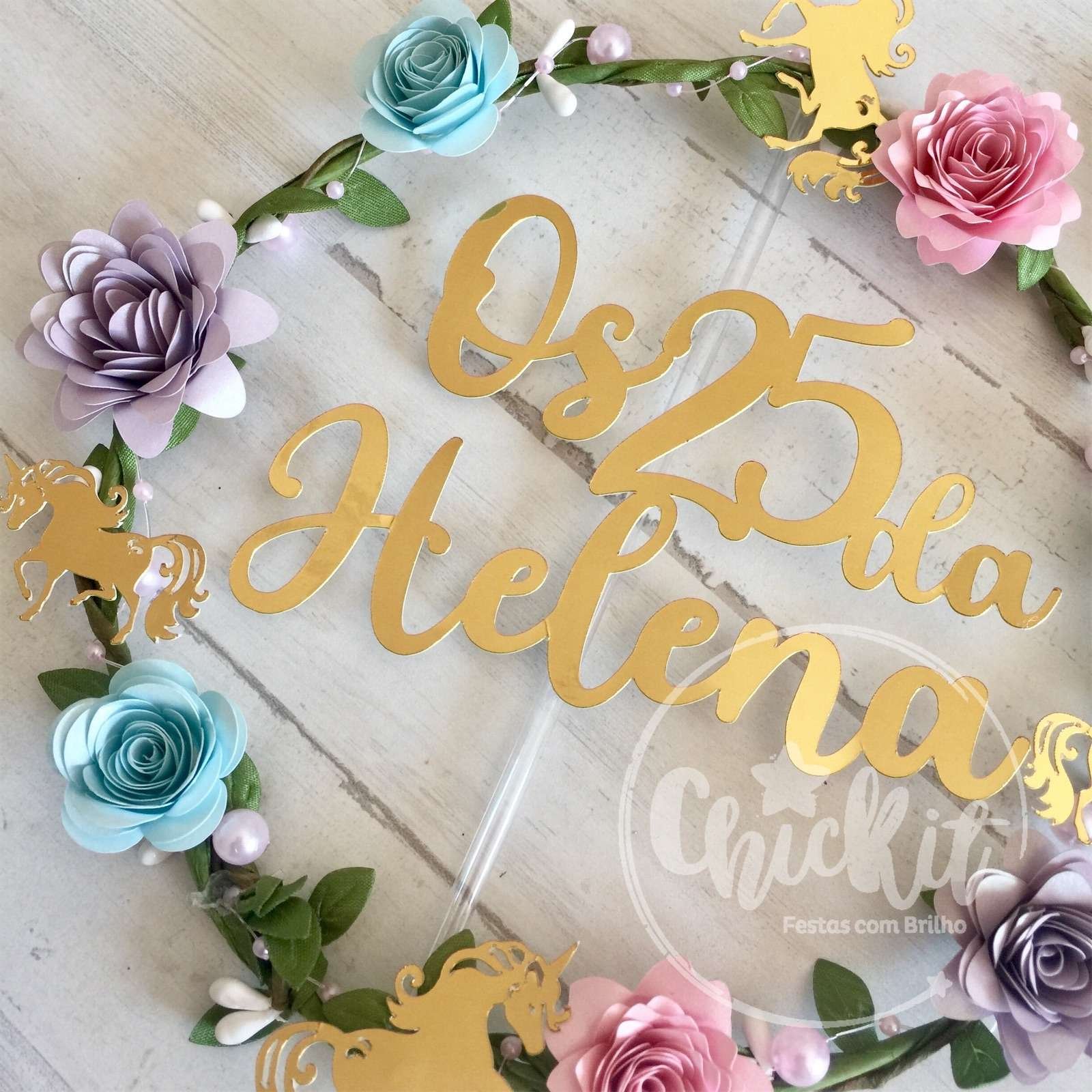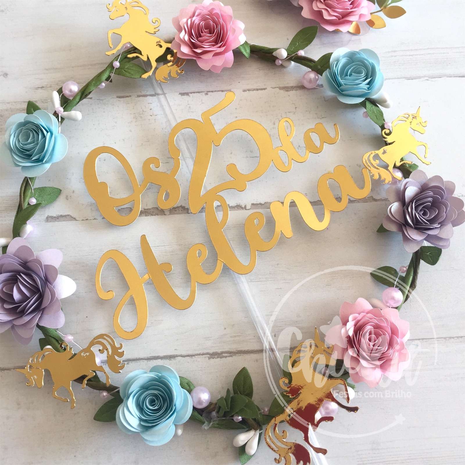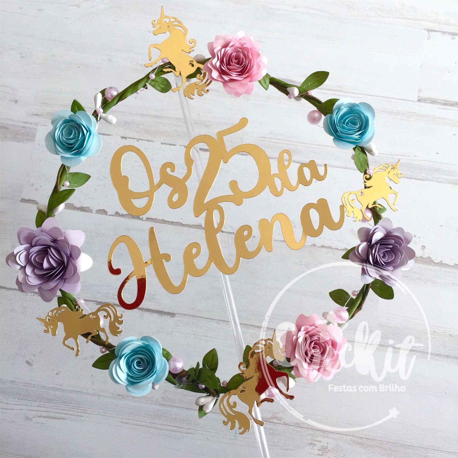 Personalizável com nome ou idade, este topo adornado com flores e pequenos unicórnios em cartolina, proporciona um toque mágico ao teu bolo.