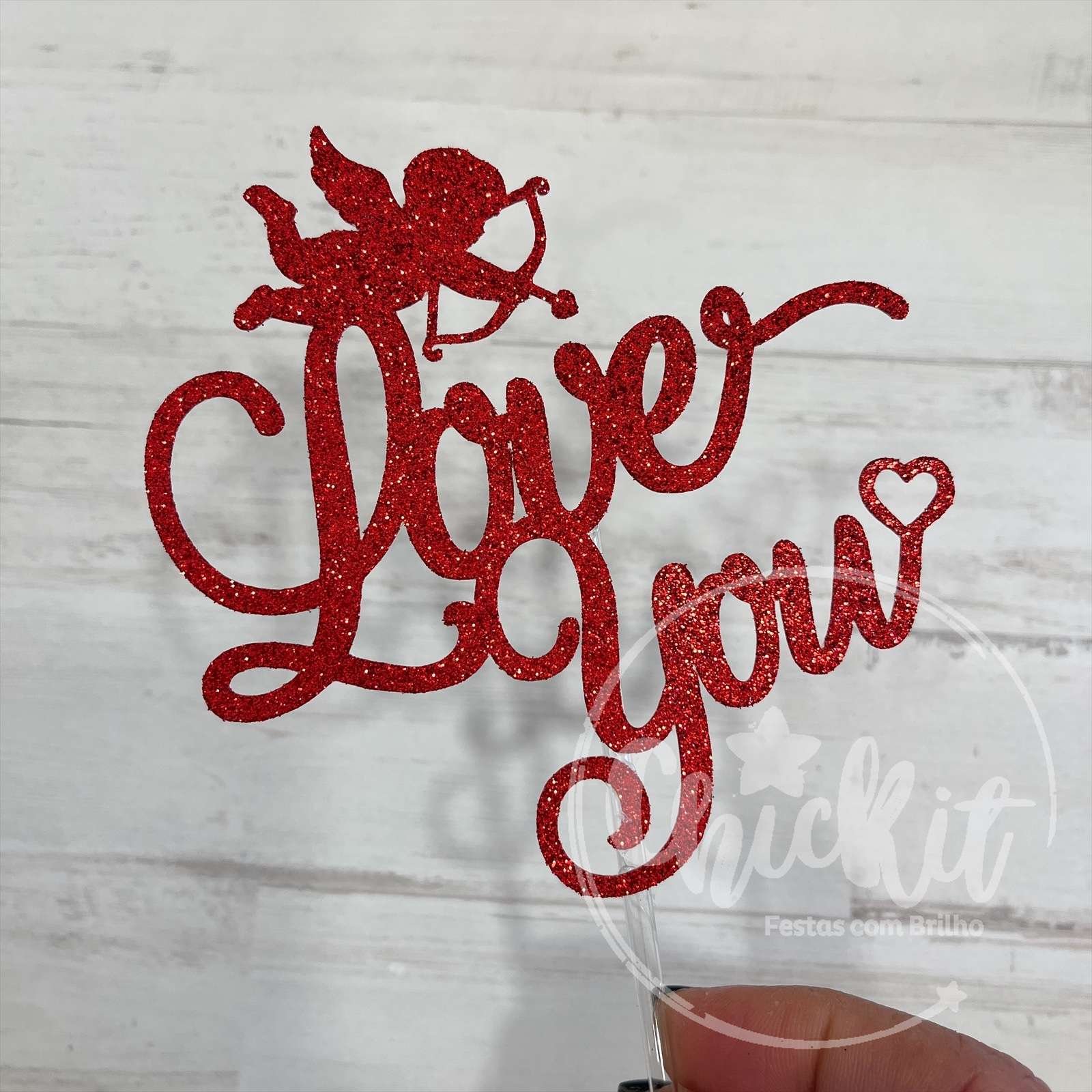 Este pack encantador inclui 10 topos de bolo de 10 cm, 8 mini topos com “Love” e “Amor” e 6 corações, todos com pauzinhos transparentes.