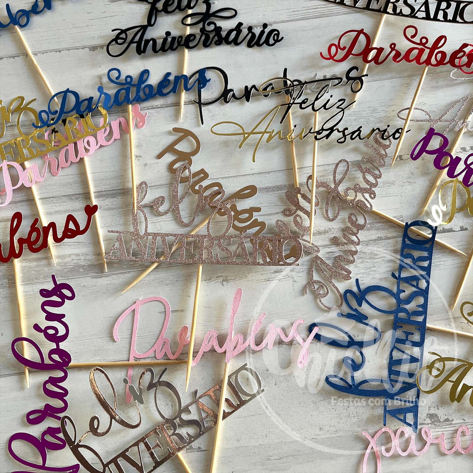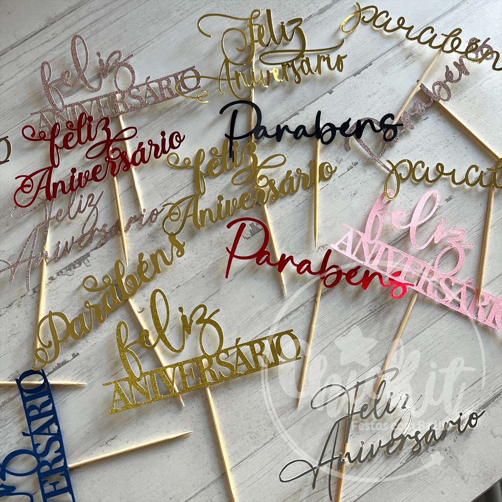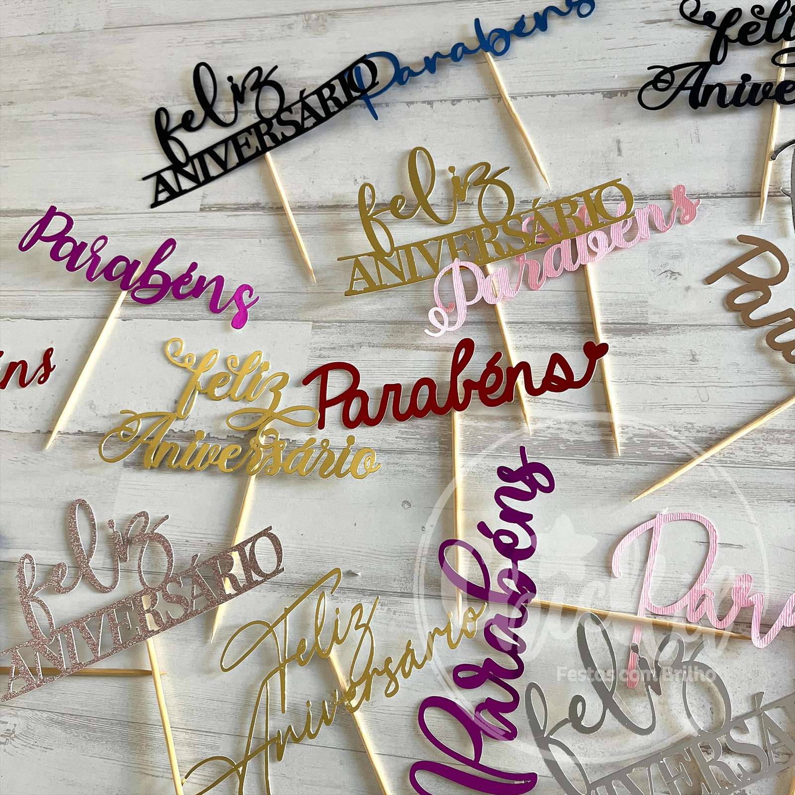 Contém 12 Topos de Bolo – 6 parabéns + 6 Feliz Aniversário. (modelos variados)