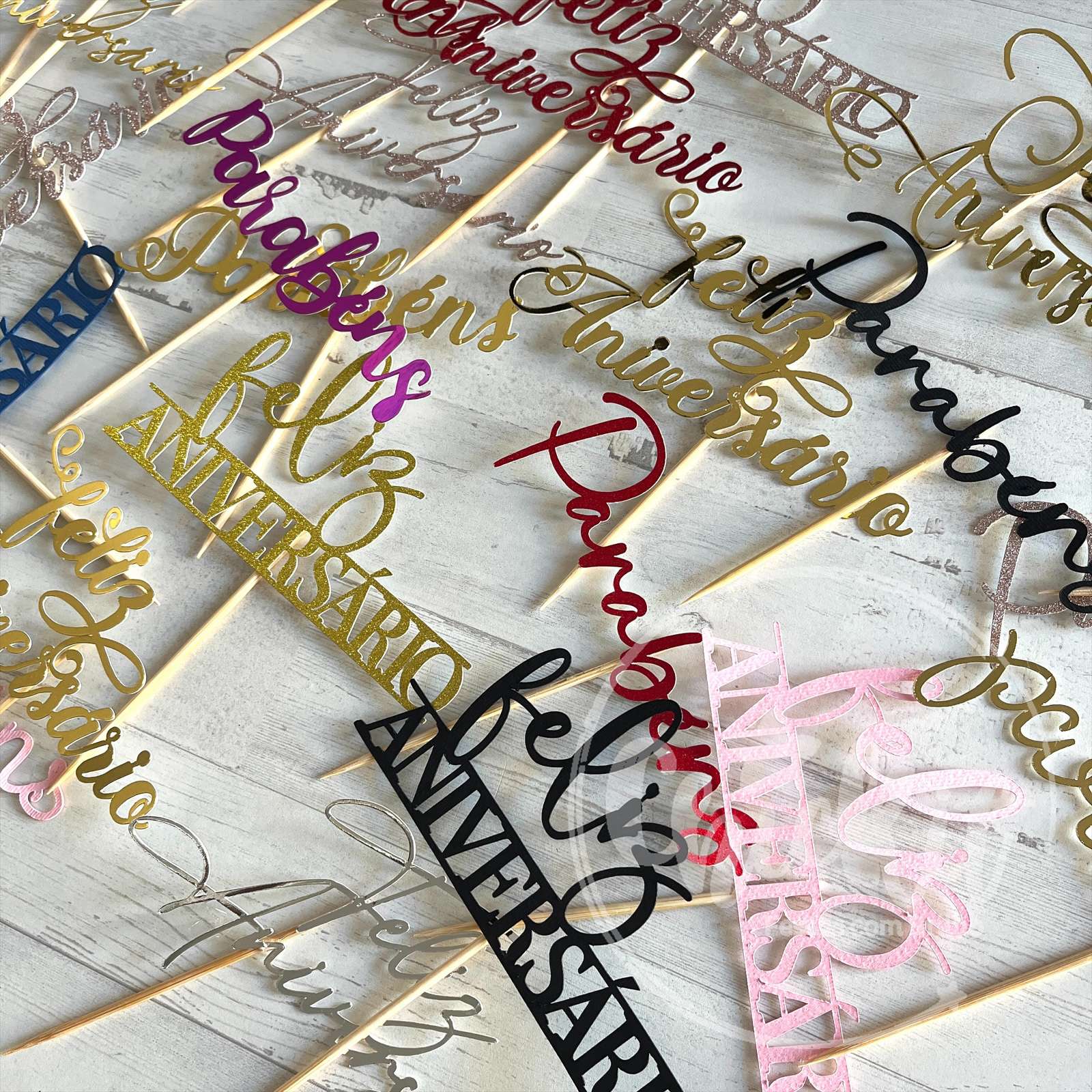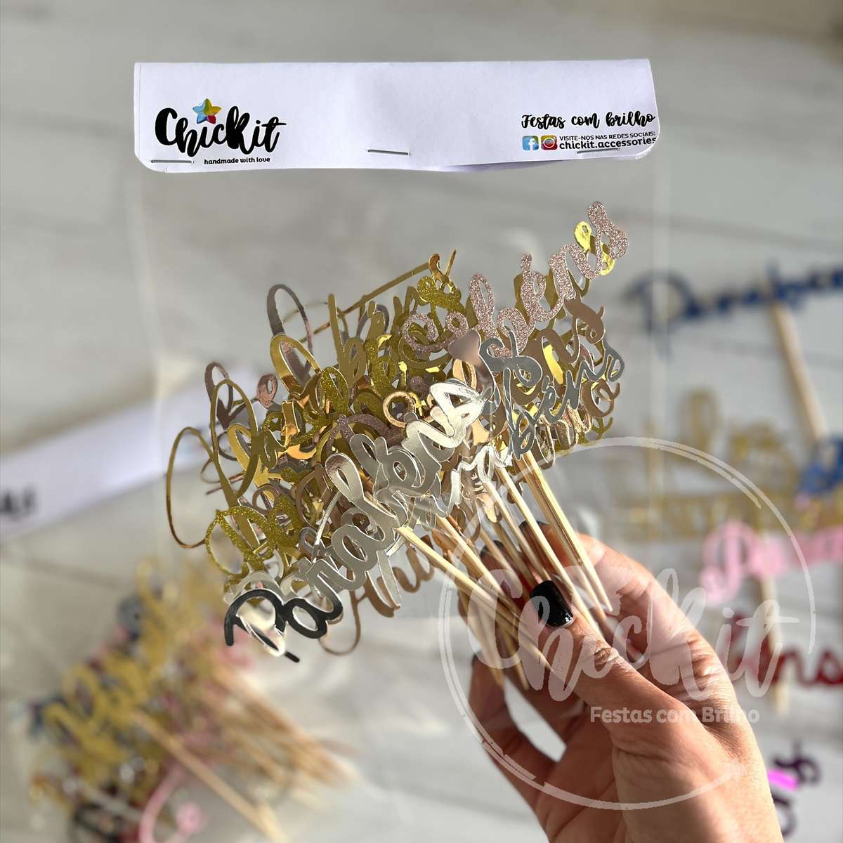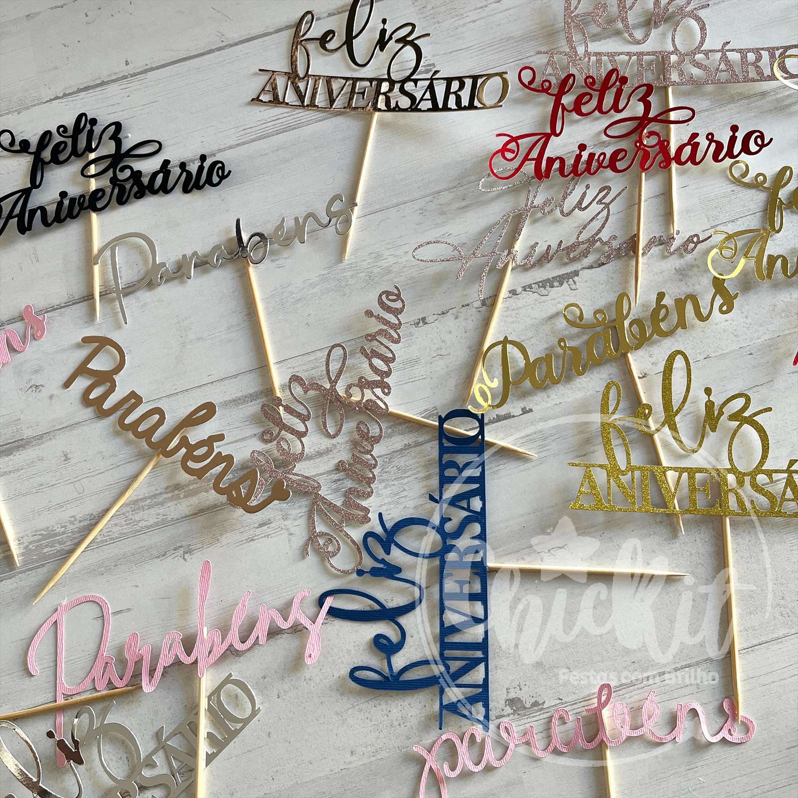 Contém 12 Topos de Bolo – 6 parabéns + 6 Feliz Aniversário. (modelos variados)