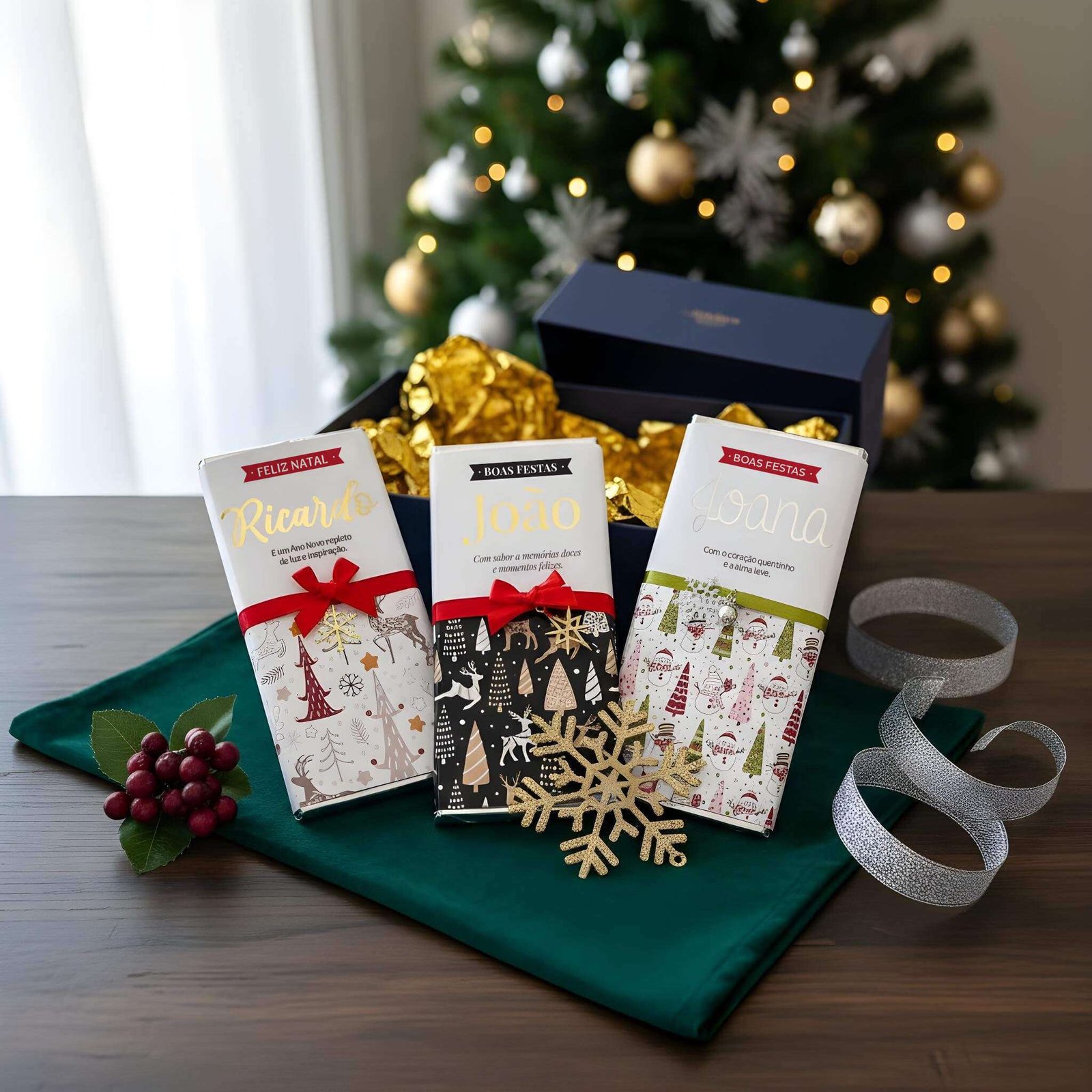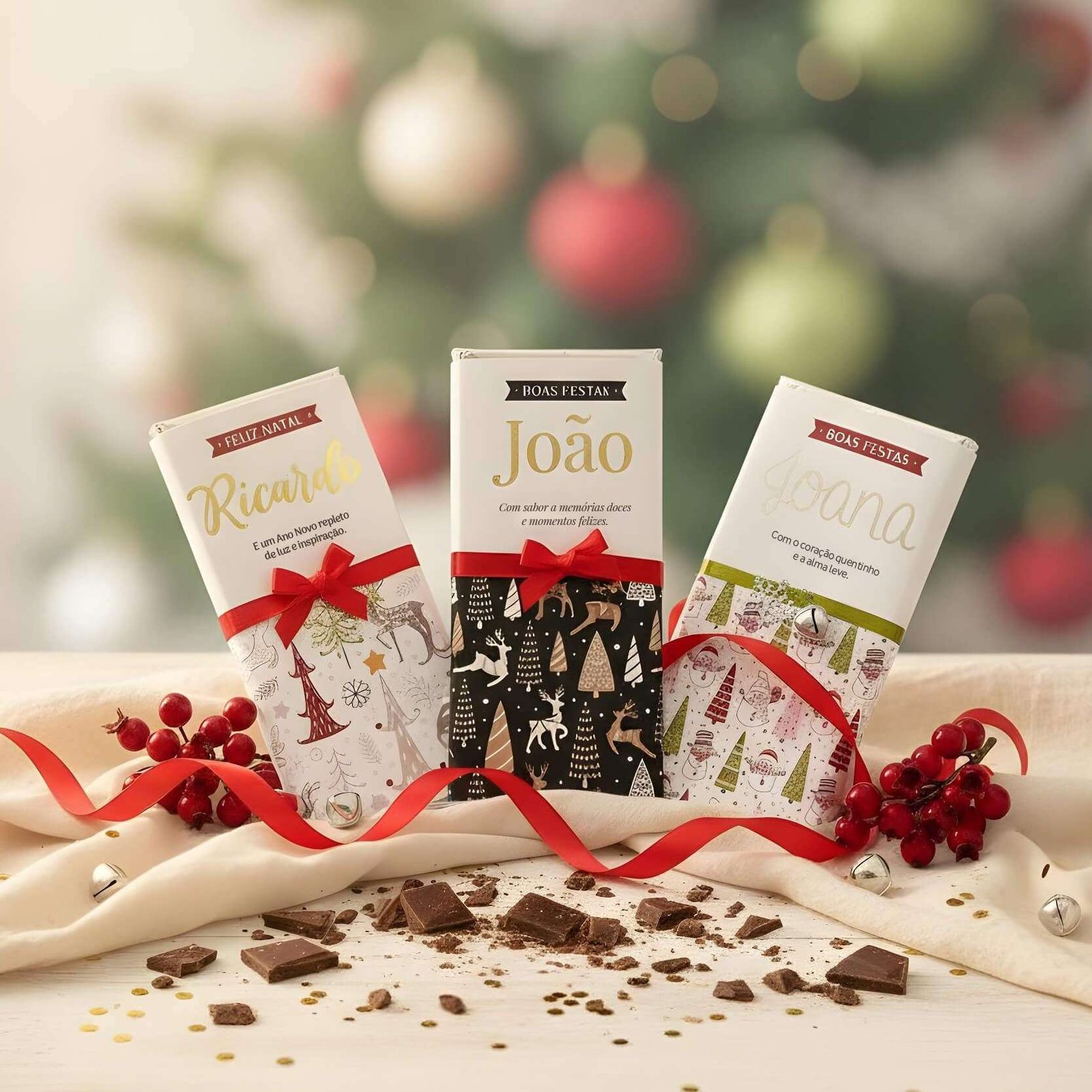 Este pack inclui 3 tabletes de chocolate personalizadas com nome, disponíveis em dois estilos — Coleção Natal Elegante e Coleção Tradição — e dois tamanhos irresistíveis: 100g Chocolate de Leite ou 200g Chocolate de Leite com Amêndoas Caramelizadas e Sal.