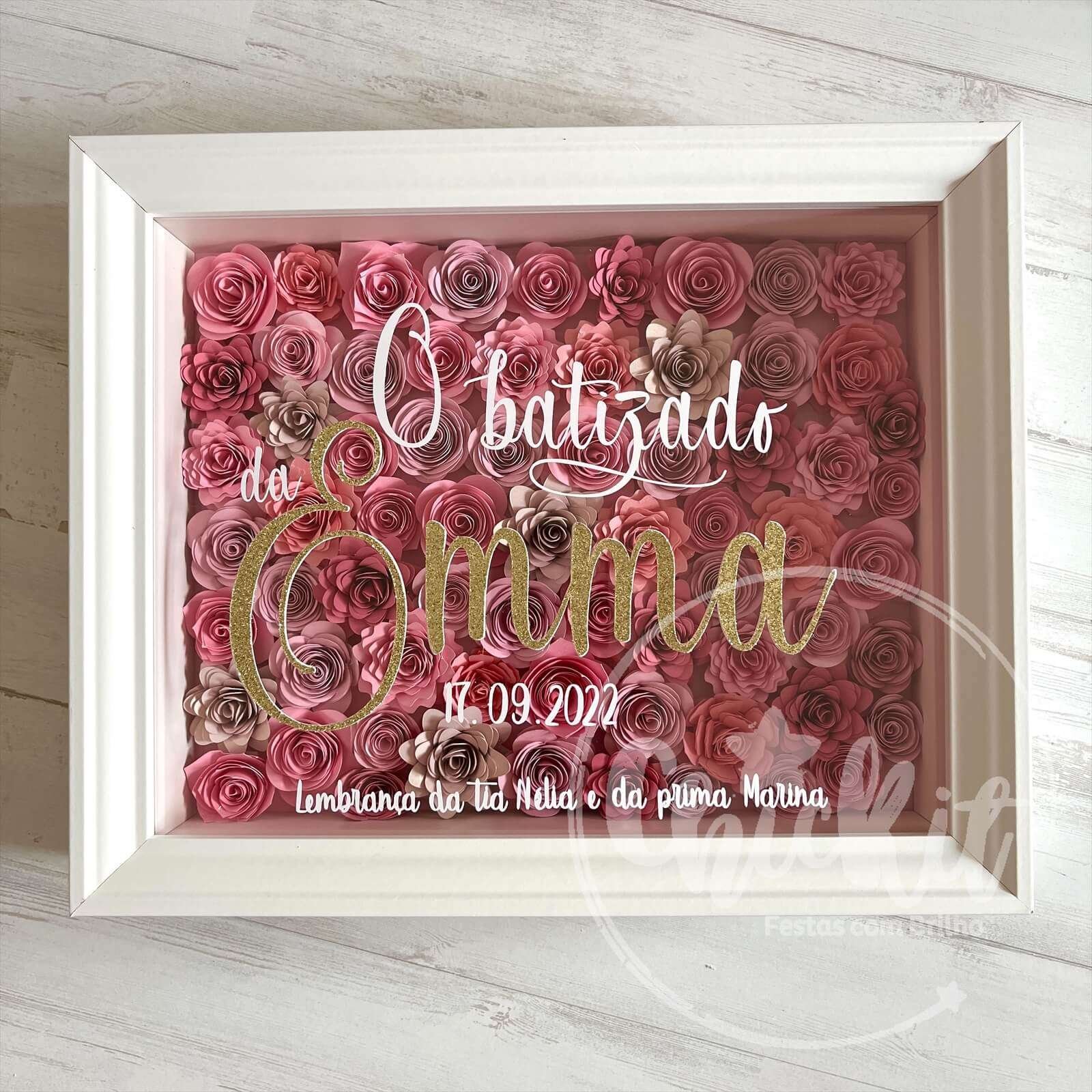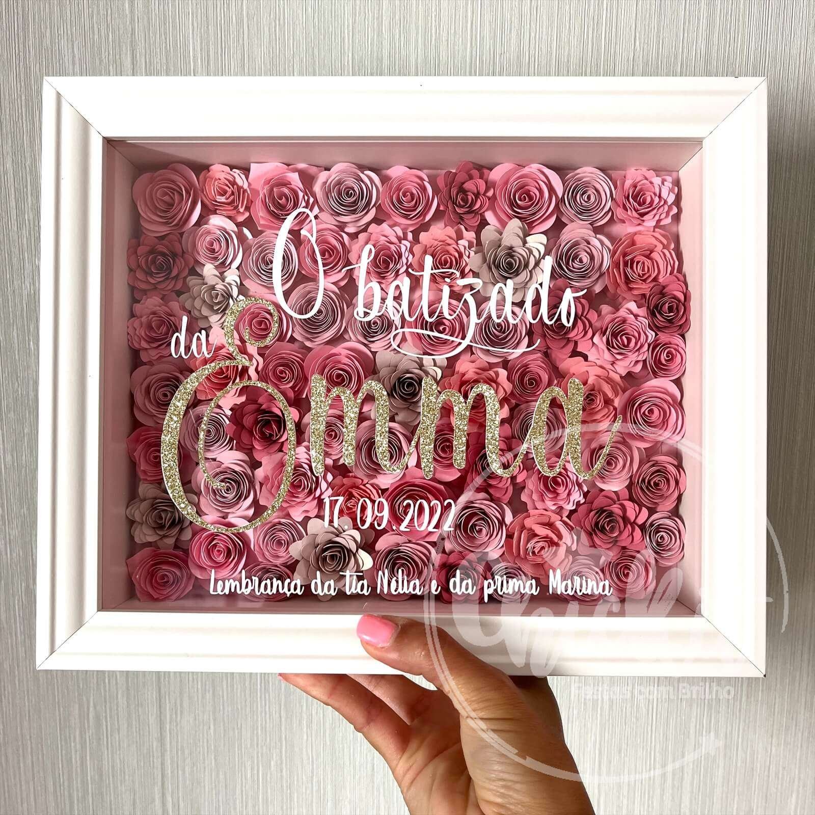 Cada quadro, com 20x25cm, é uma obra de arte artesanal que combina a beleza das flores de cartolina com personalização em vinil aplicado em acrílico.