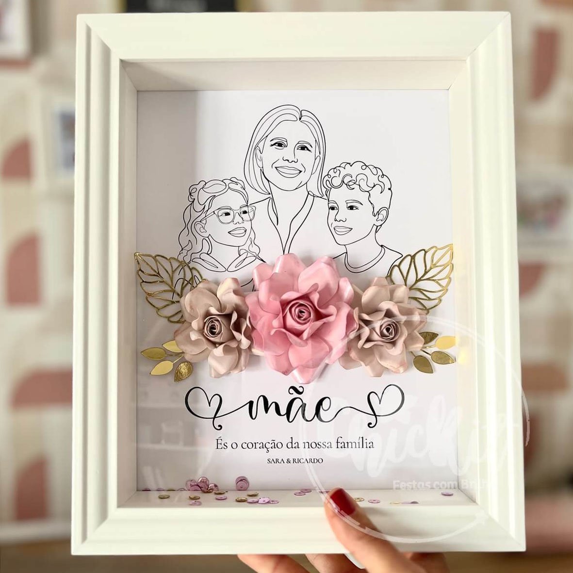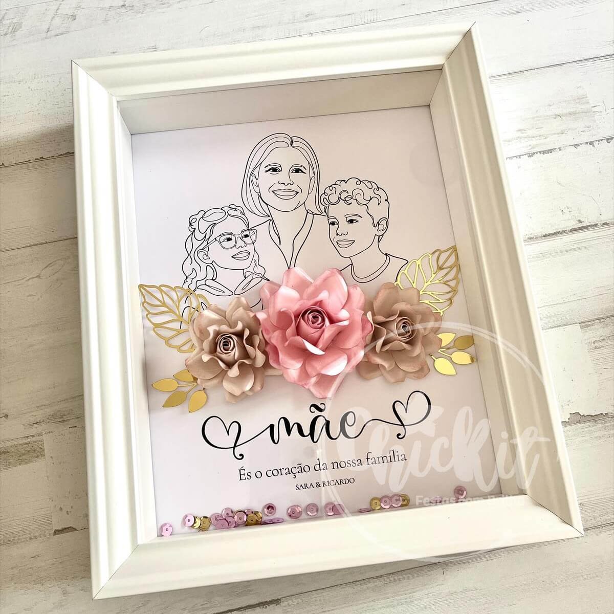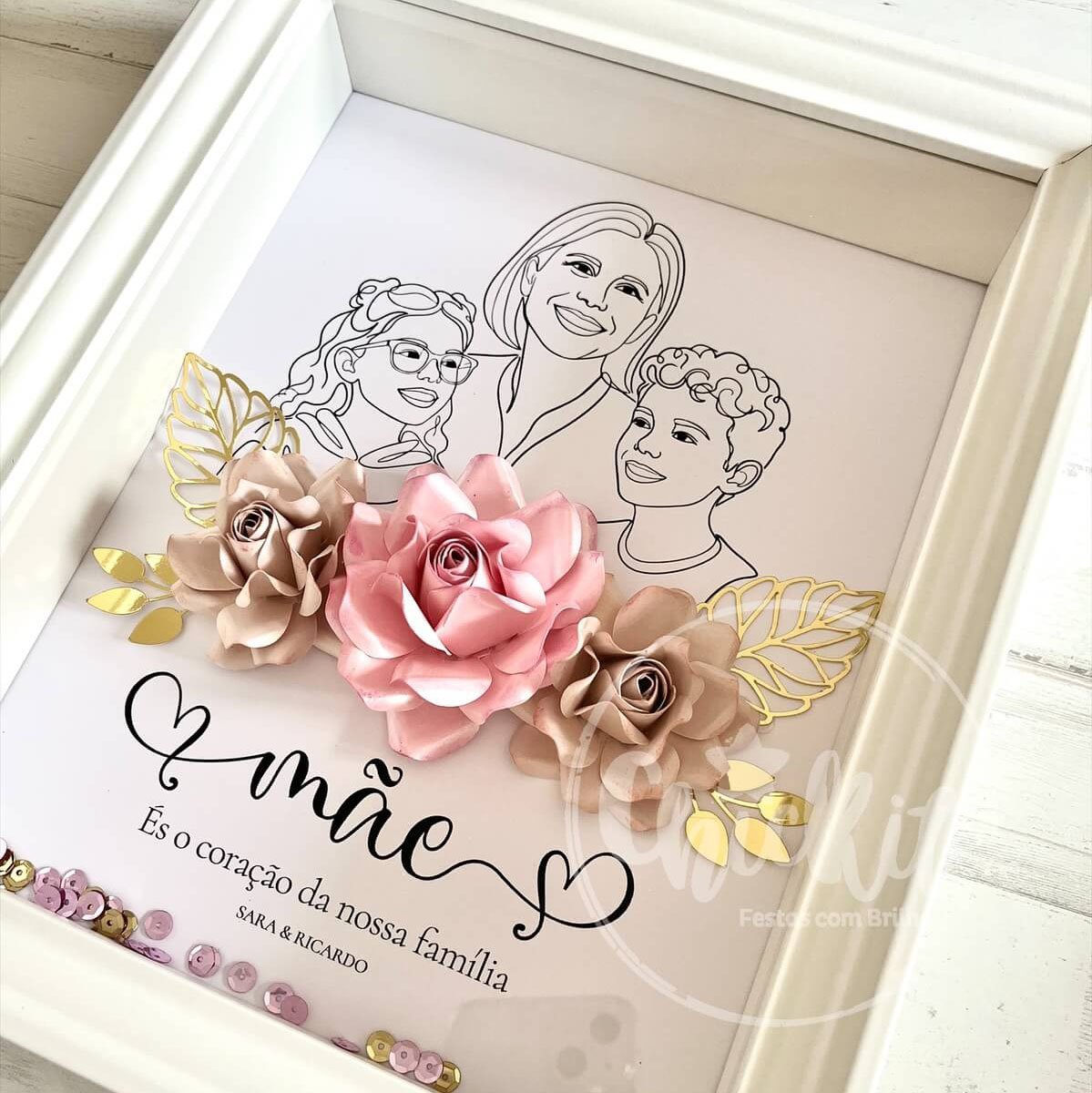 Com uma ilustração delicada e minimalista da mãe com os seus filhos, combinada com flores em papel 3D em tons suaves de rosa e detalhes dourados, este é um presente pensado para emocionar… e ficar para sempre.