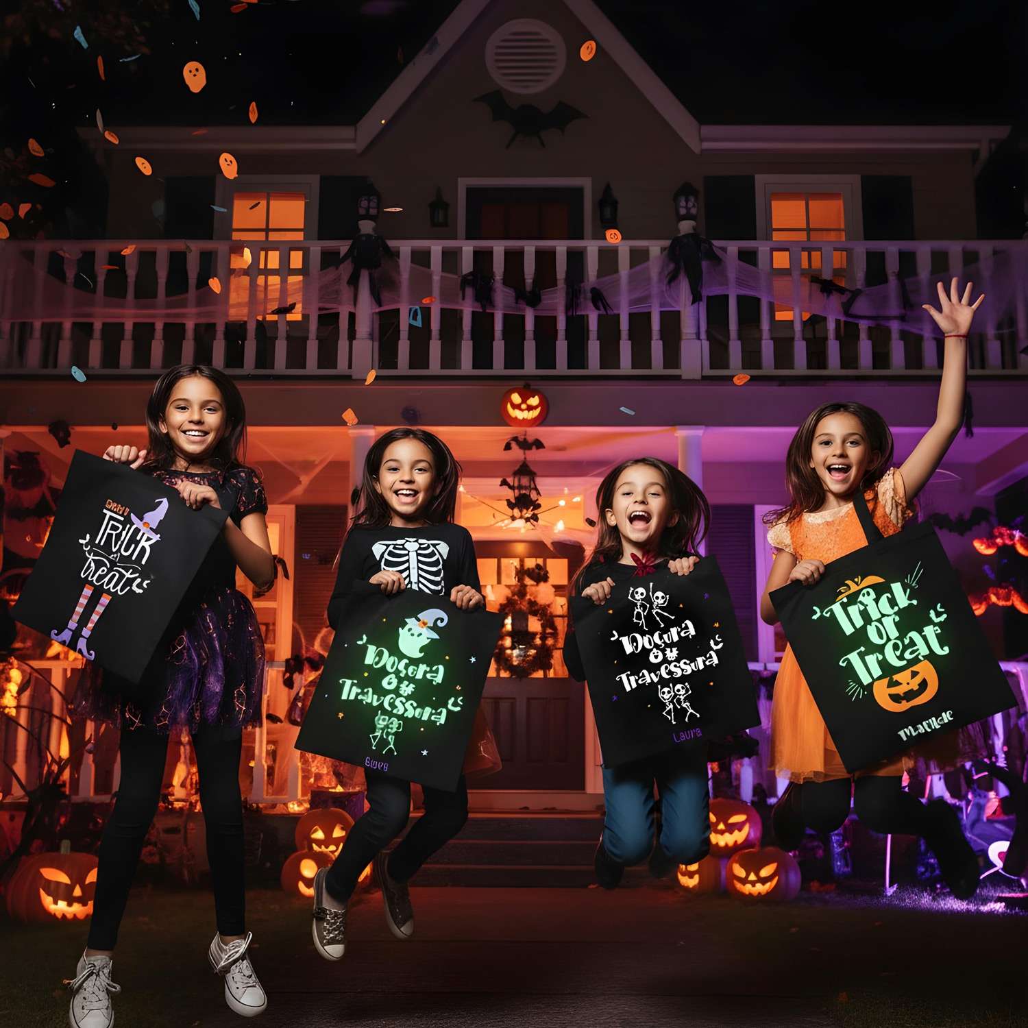 Transforma a noite de Halloween numa experiência ainda mais divertida! Tote Bag personalizada com o nome e estampagem fluorescente que brilha no escuro. Perfeita para pedir “Doçura ou Travessura” com muito estilo.