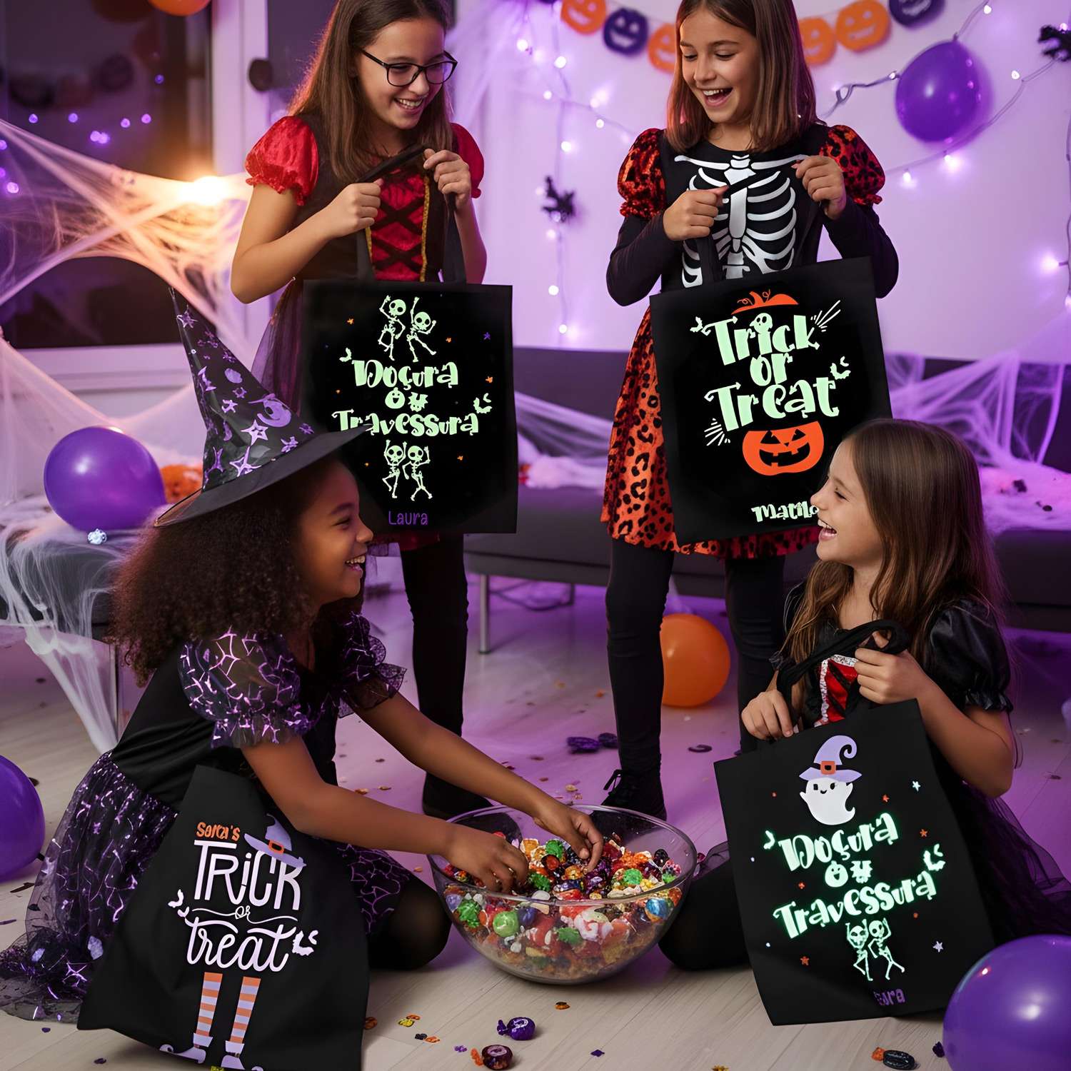 Transforma a noite de Halloween numa experiência ainda mais divertida! Tote Bag personalizada com o nome e estampagem fluorescente que brilha no escuro. Perfeita para pedir “Trick ou Trat” com muito estilo.