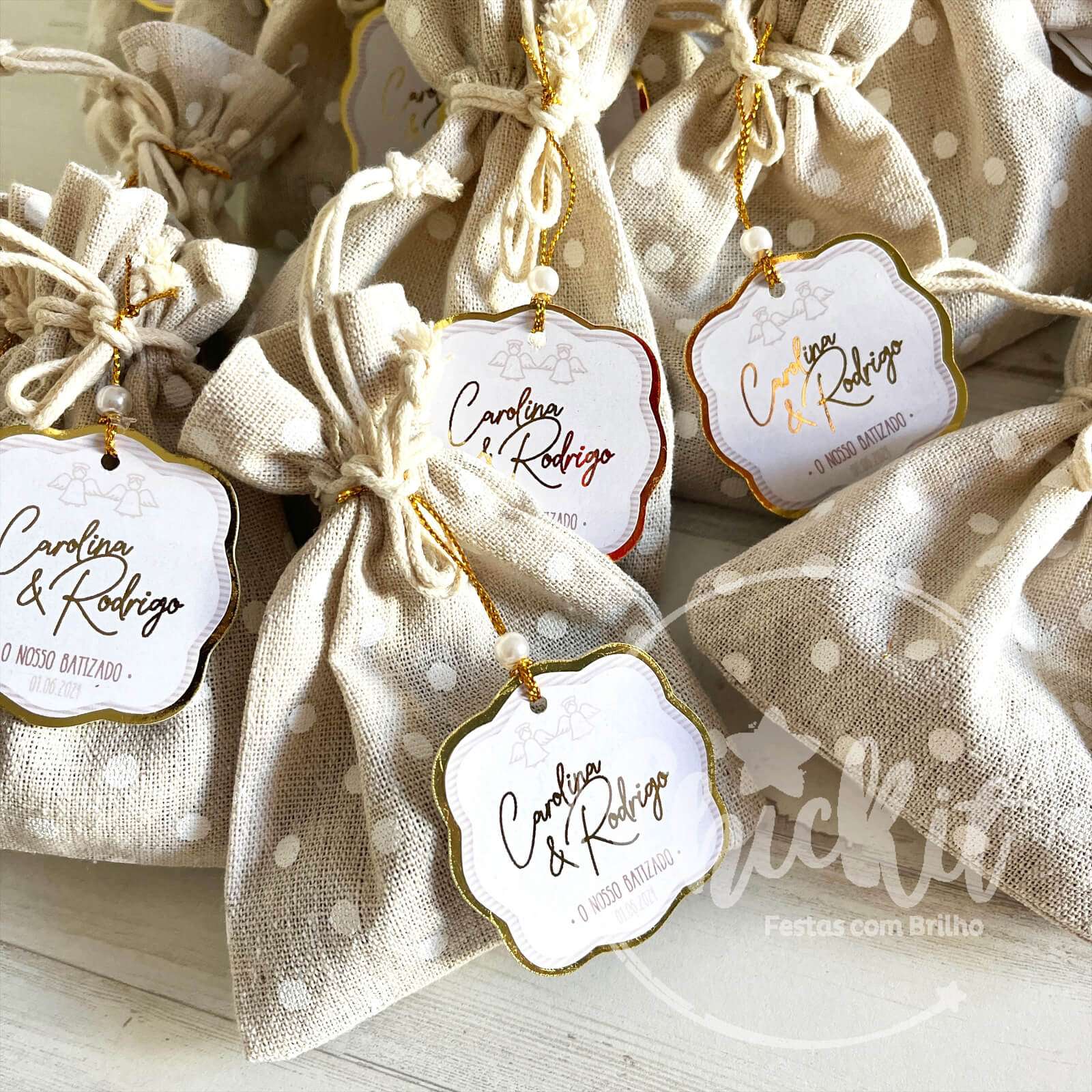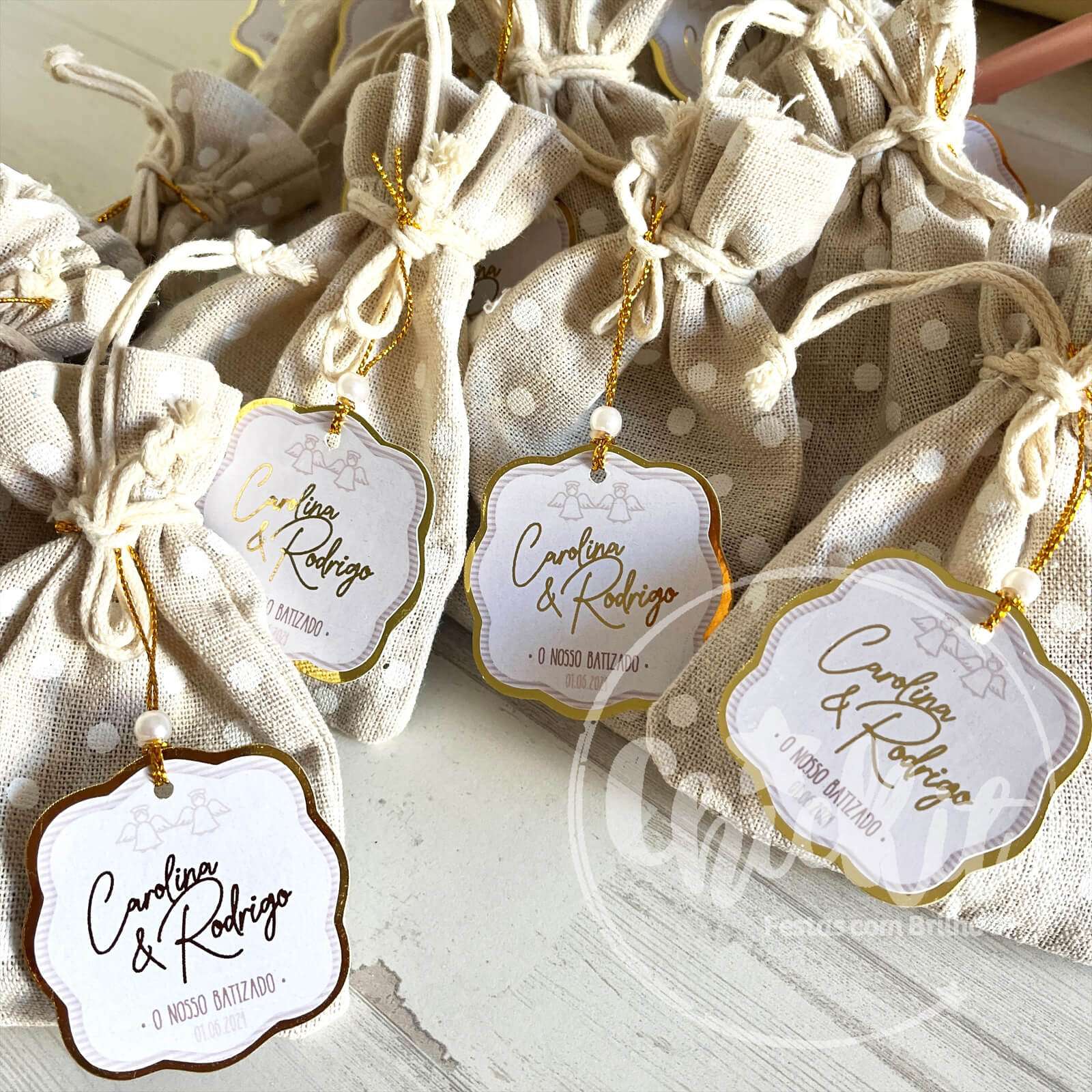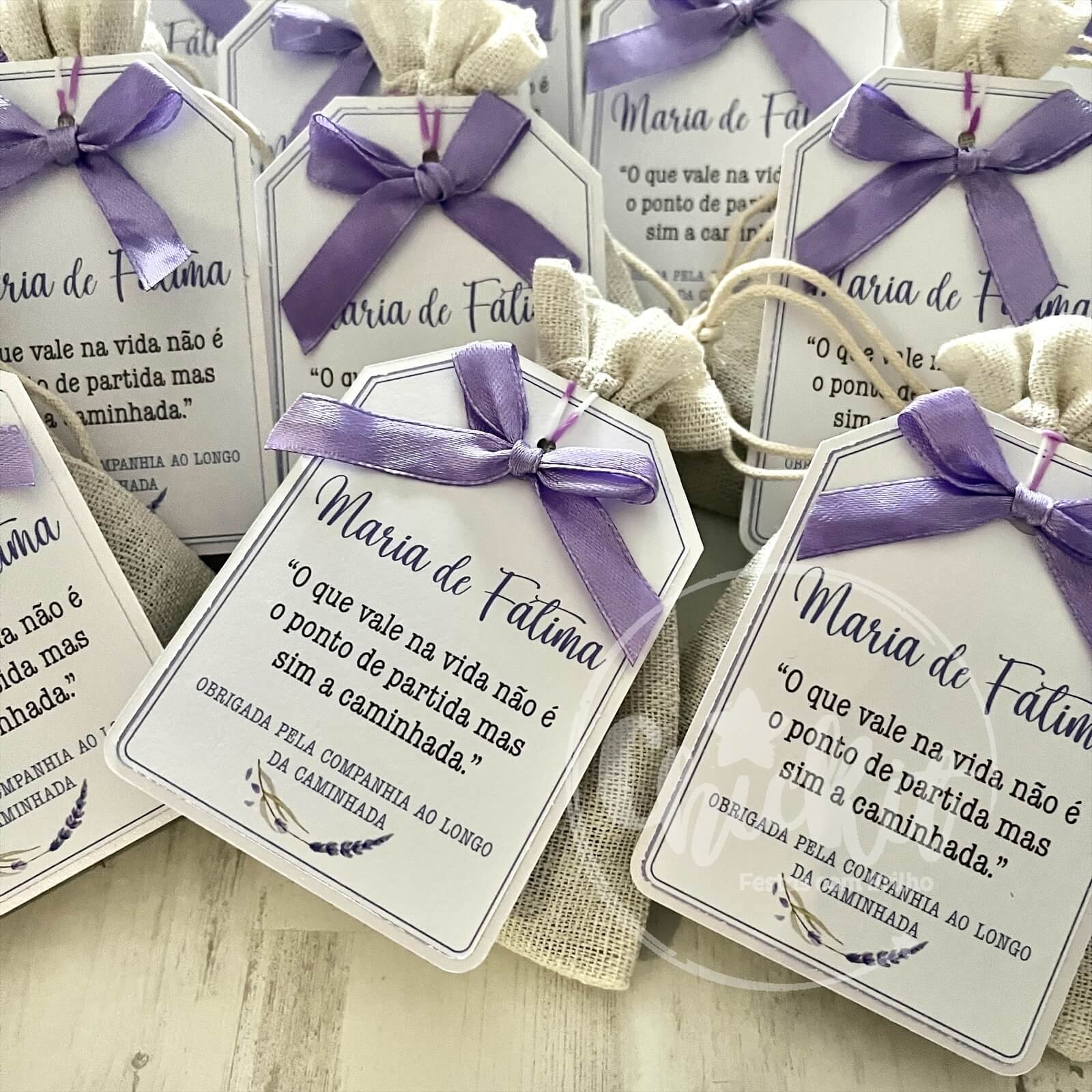 Cada saquinho inclui alfazema natural, envolvida num tecido delicado e finalizado com uma etiqueta personalizada com o nome, data ou mensagem que escolheres.