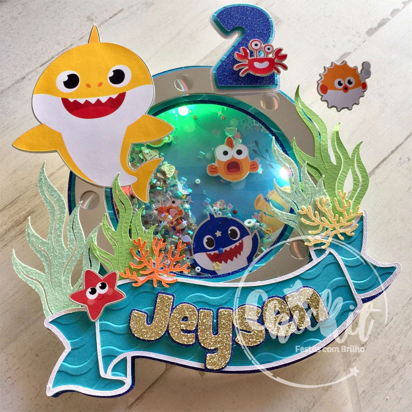 Topo de Bolo Shaker “Baby Shark” – Personalize com Nome e Idade, com ou sem Luz LED!