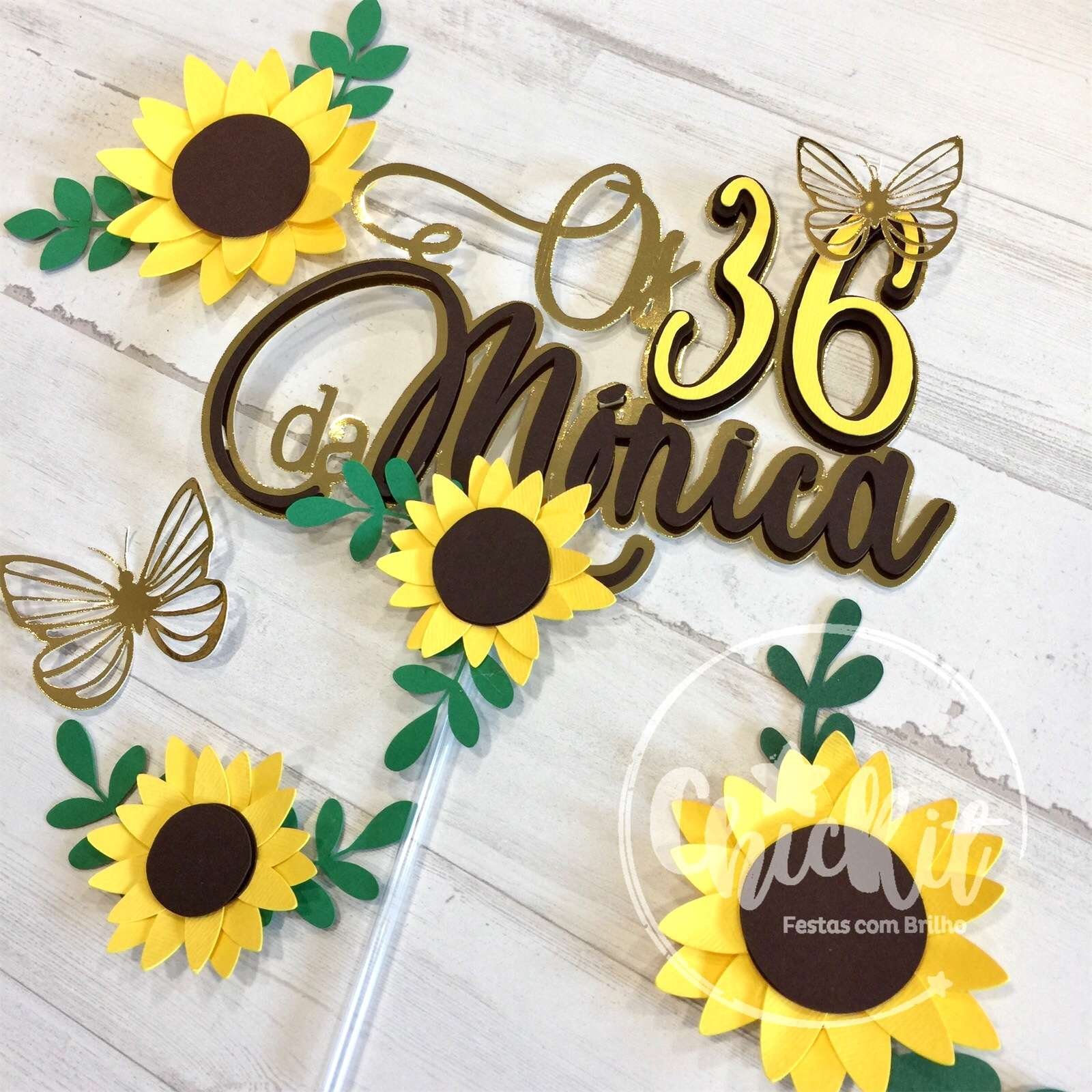 Este topo, personalizável com nome e idade, inclui pequenos girassóis extras para adicionar charme ao seu bolo.