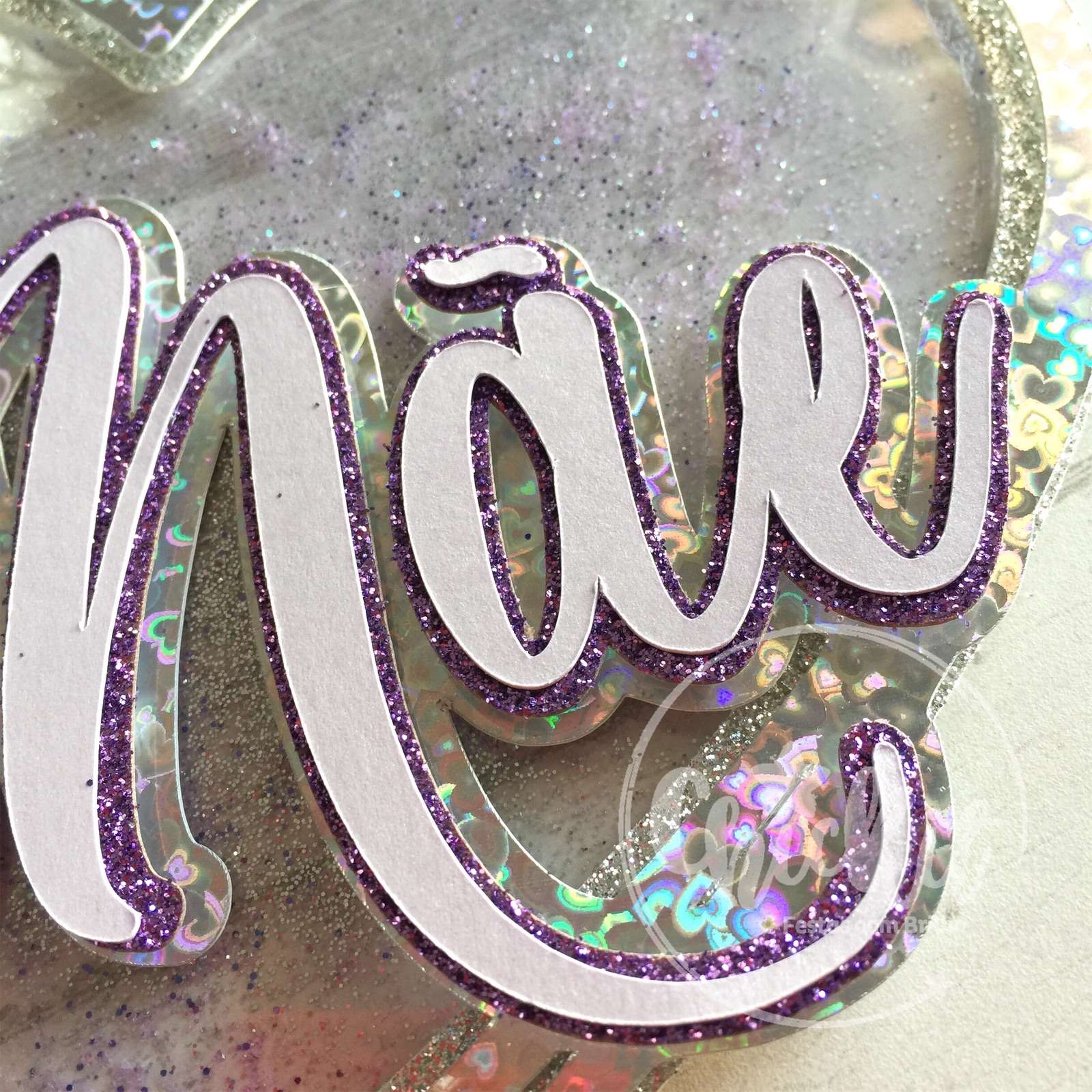 Este topo de bolo é uma fusão de elegância e brilho, com flores de papel artesanais, detalhes em acetato transparente e toques de glitter reluzente.