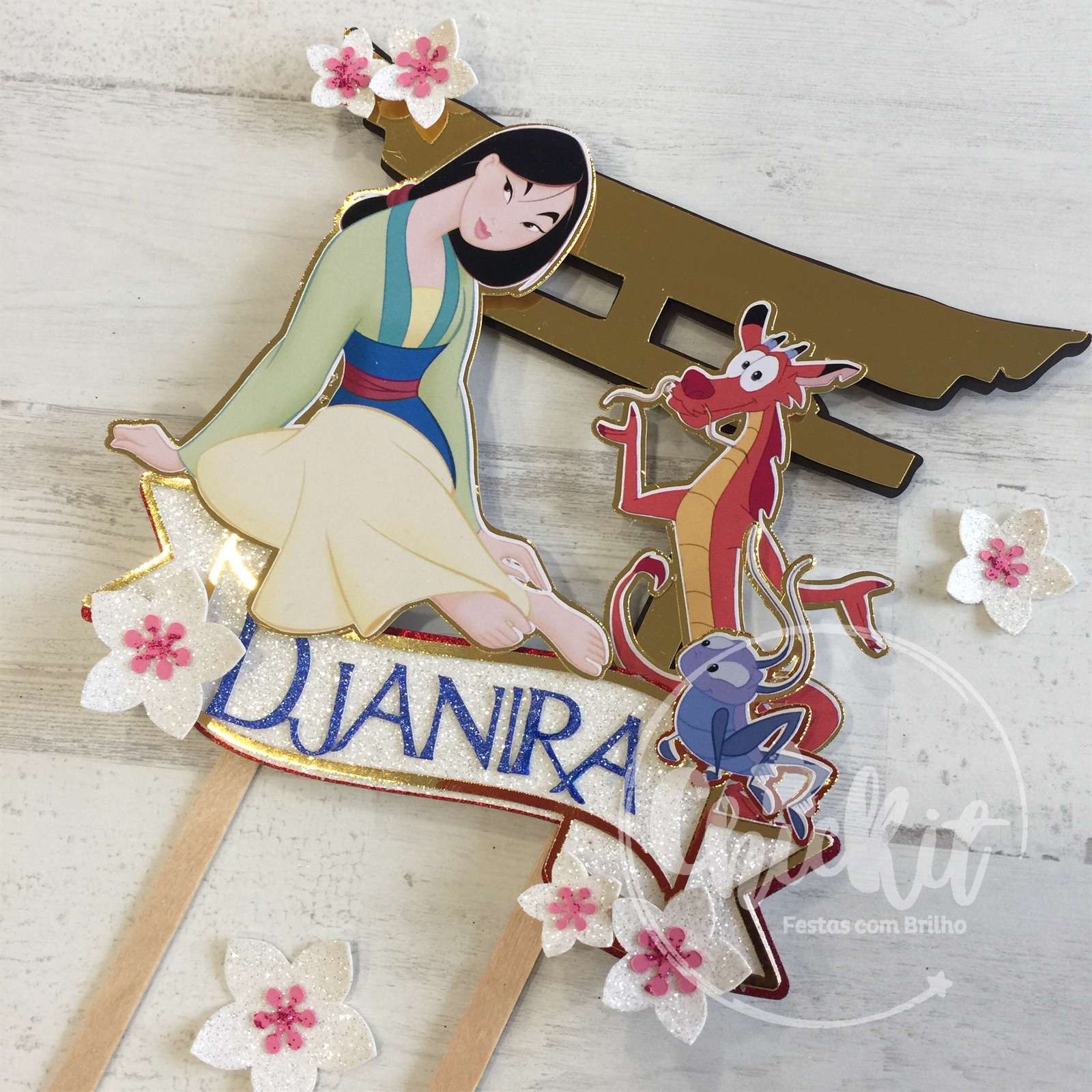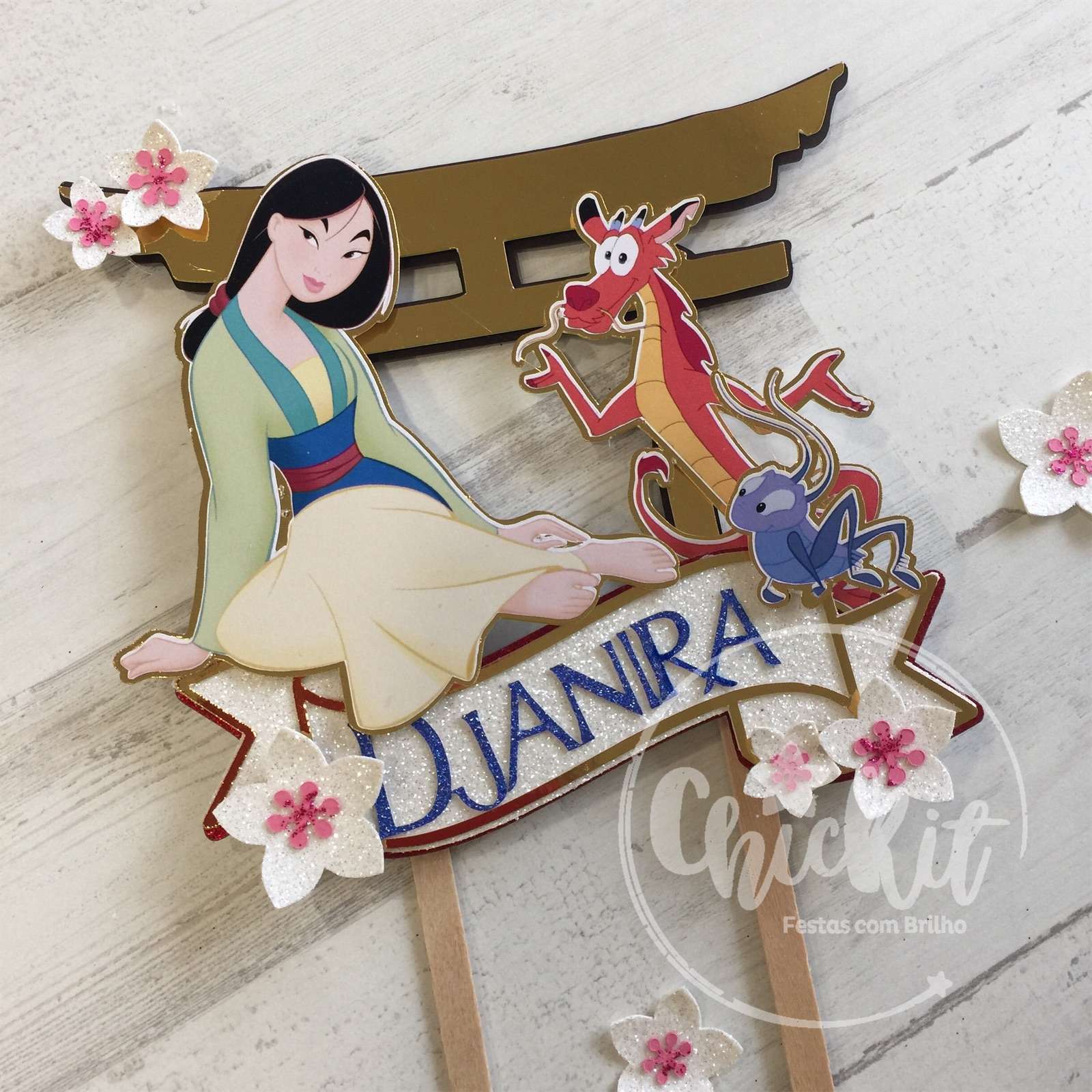 Celebre com bravura! Personalize o topo com nome e idade, inspirando-se na coragem da lendária Mulan.