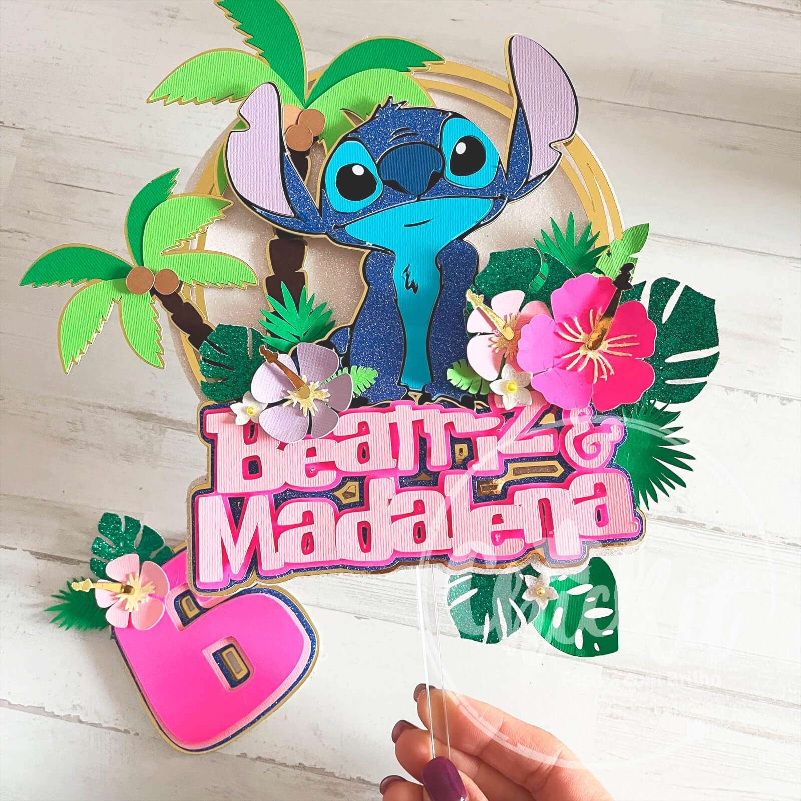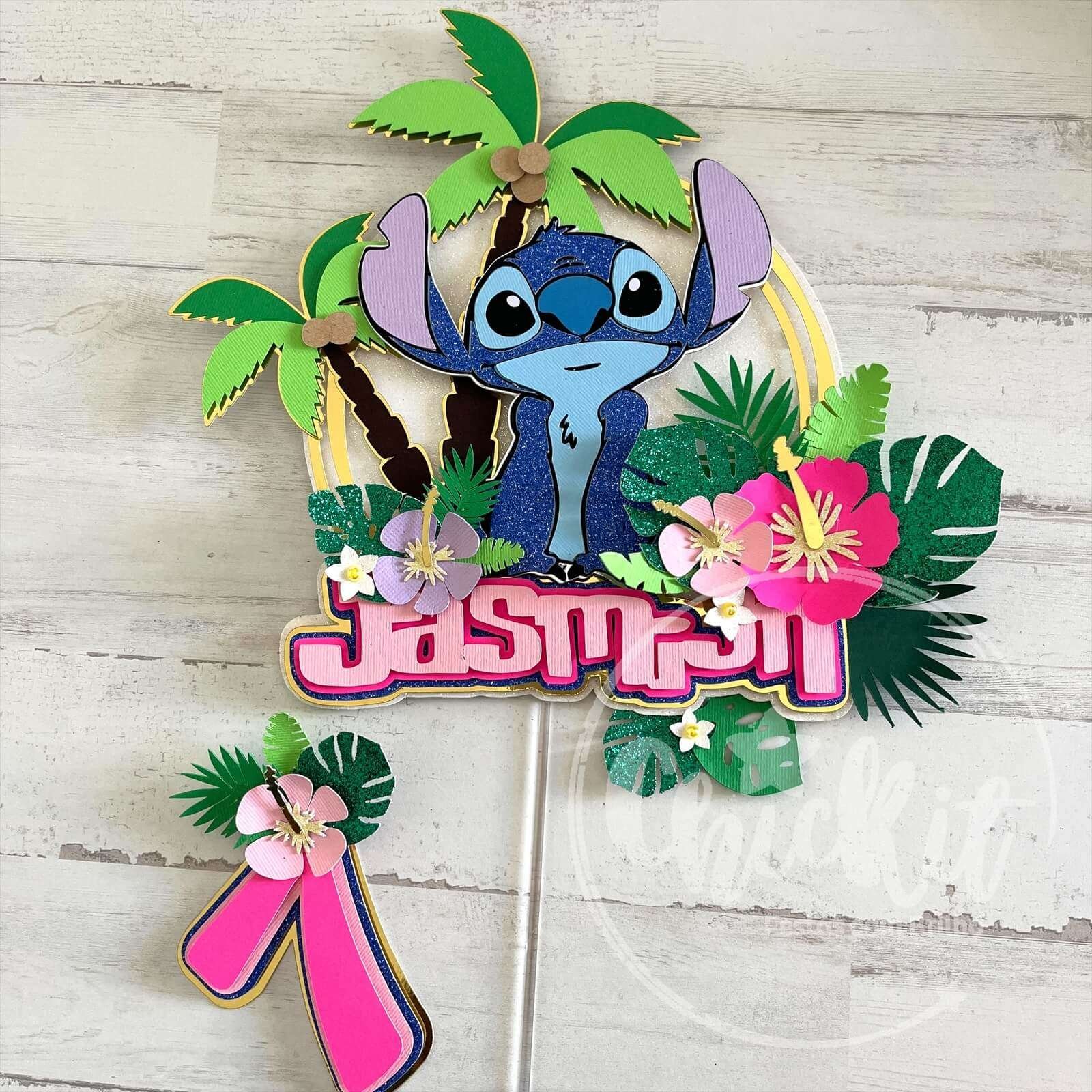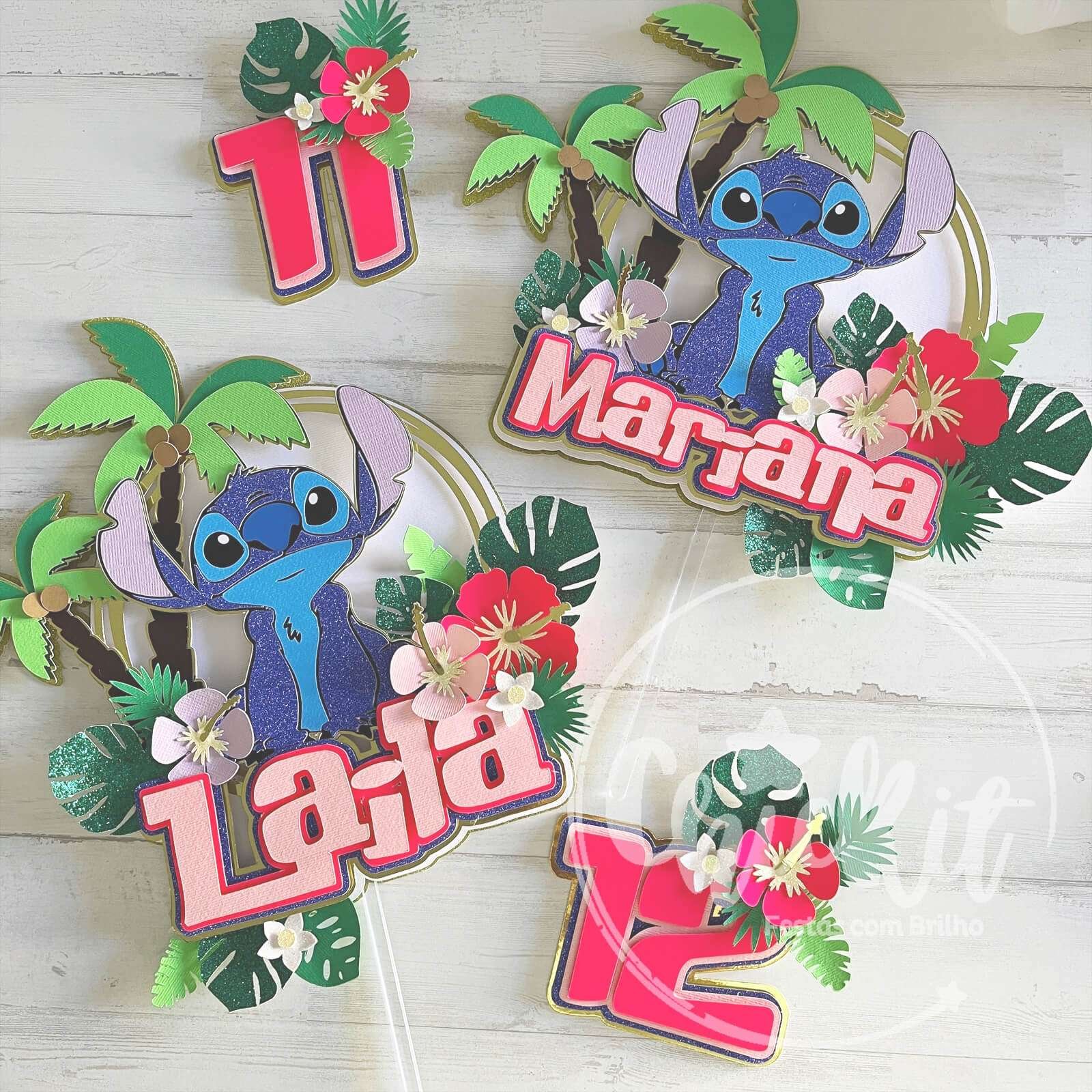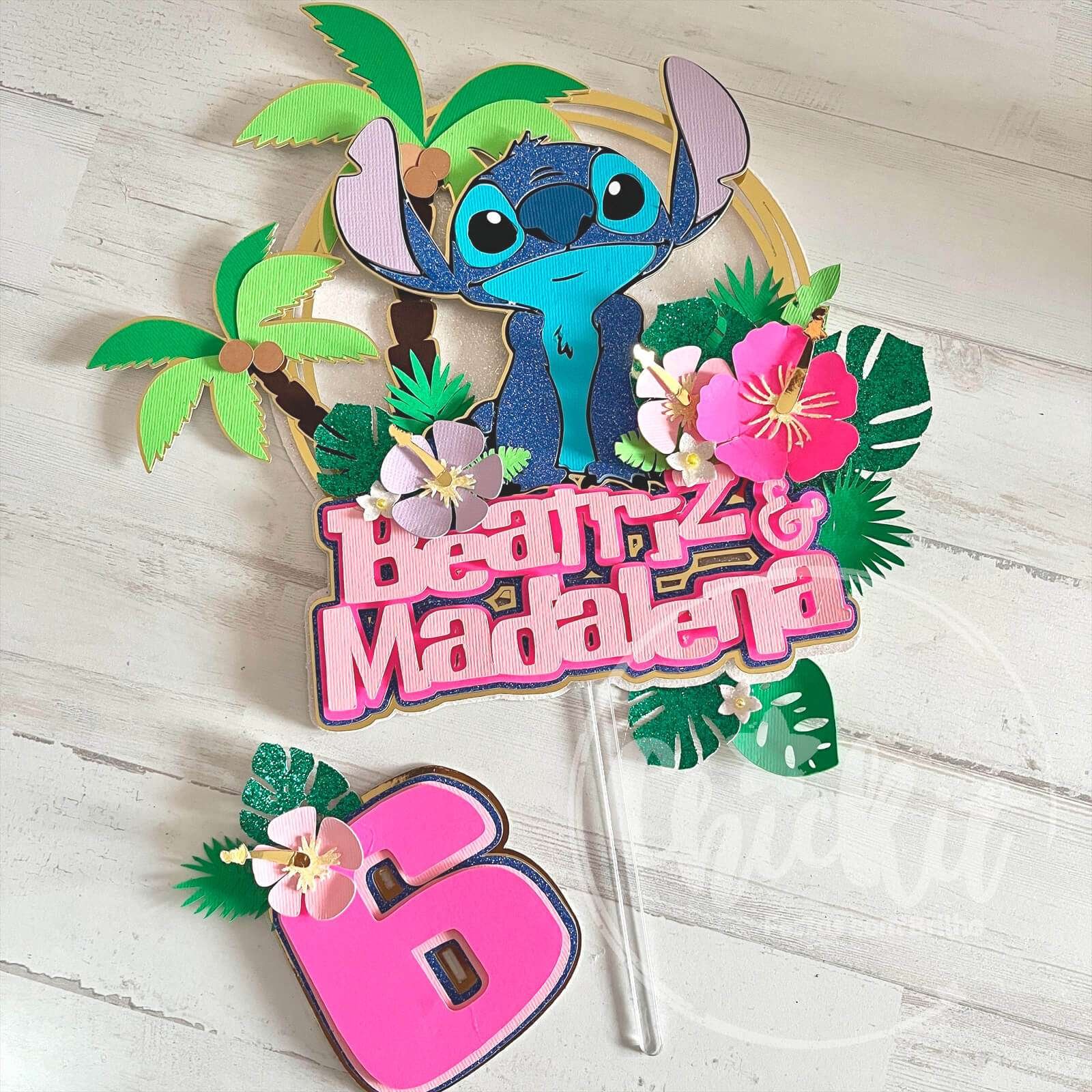 Imagina a alegria no rosto dos teus filhos quando virem o seu personagem favorito a decorar o bolo! Este topo não só se destaca pela sua beleza, brilho e cores vibrantes, mas também eleva a decoração de qualquer bolo a outro nível. Ideal para festas temáticas de Stitch, uma peça que não vai passar despercebida, nem vai deixar ninguém indiferente. Este acessório de decoração de bolo é feito com camadas de papel e cartolinas de alta qualidade, garantindo um acabamento vibrante e cheio de brilho. Personaliza-o com o nome e idade do aniversariante, tornando cada festa única e memorável.
